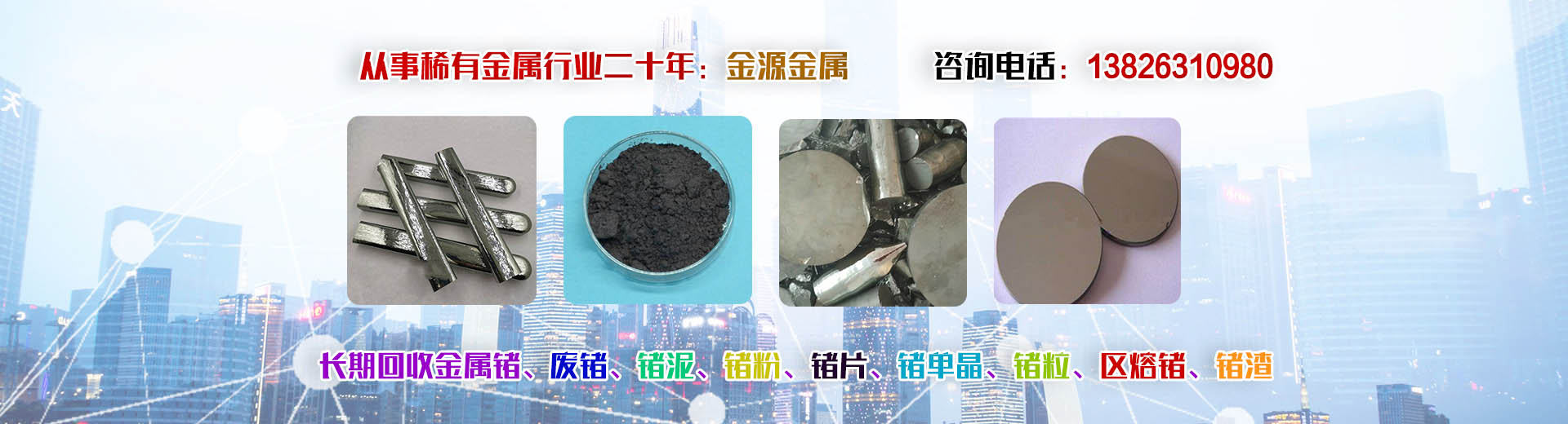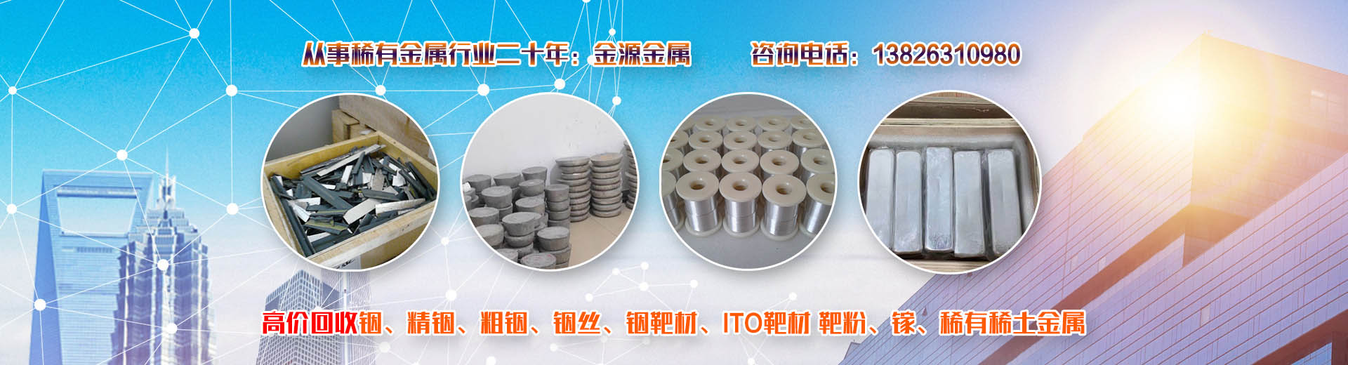 韶關(guān)市金源金屬材料有限公司坐落于中國廣東省韶關(guān)市,長期收購回收銦、精銦、粗銦、銦絲、銦靶材、ITO靶材靶粉、回收金屬鍺、鍺錠、鍺粉、鍺片、回收鍺單晶、單晶鍺、鍺粒、區(qū)熔鍺、工業(yè)鍺、廢鍺、鍺泥、鍺渣、二氧化鍺回收、四氯化鍺、有機鍺、銀、純銀、銀靶材、高價收購回收ITO廢靶、回收廢銦、廢銦沙、廢銦渣、回收粗銦、廢銦絲、廢銦珠、廢銦箔、廢銦棒、收購銀焊條、銀焊絲、導電銀膠、金屬鎵、硝酸鎵、氧化鎵、三氯化鎵、氯化鎵,供應及回收氧化鎵、氫氧化鎵、碲化鎵,硒化鎵,銦粉,氧化銦、氯化銦、硫酸銦、硫化銦、醋酸銦、氫氧化銦、硒化銦,碘化銦,銅銦鎵硒,含金、銀、銦、銠、鈀、鎵、鍺等稀有貴金屬材料,稀土金屬材料、氧化鏑、氧化镥、氧化鋱、氧化鐠釹等回收。